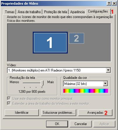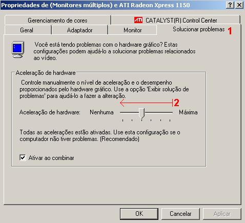2 - A tela 'Propriedades de Vídeo' será aberta. Clique na aba 'Configurações' e em seguida no botão 'Avançadas'. 3 - Na tela seguinte, clique na aba 'Solucionar Problemas', para visualizar a 'Aceleração de Hardware'. 4 - Na barra de controle da 'Aceleração de Hardware', diminua o cursor gradativamente e clique em Aplicar. A cada redução (recomendamos que seja reduzido até a metade inicialmente), teste o software Dynstar 1 até que a execução seja feita normalmente. |